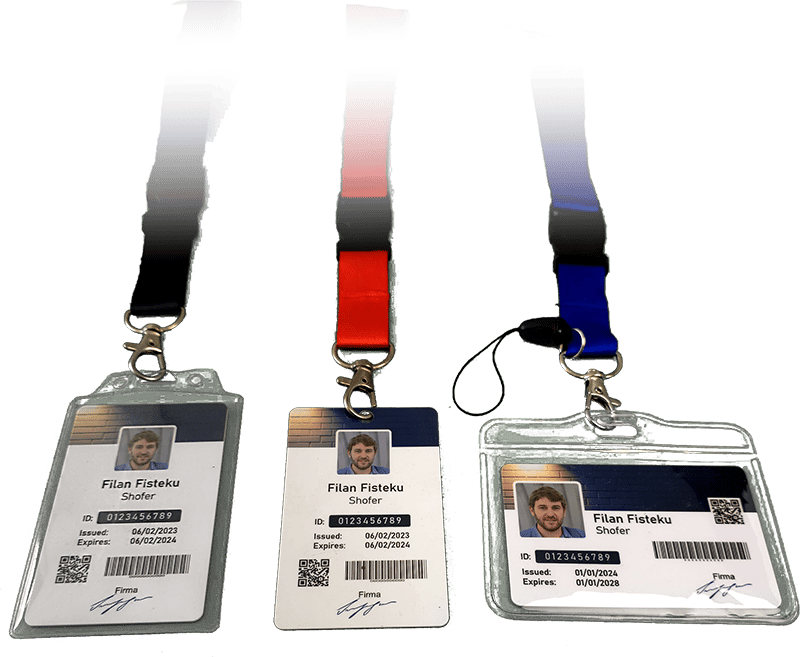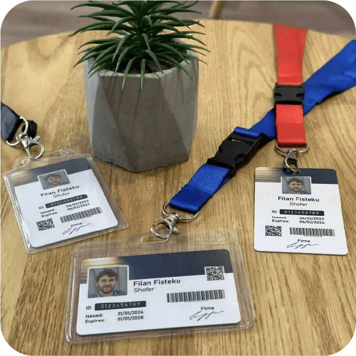 Karta brenda: të bardha ose të personalizuara (emër, foto, titull, barcode/QR code); me çip (RFID/NFC) ose pa çip
